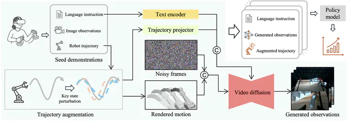 The collection of large-scale and diverse robot demonstrations remains a major bottleneck for imitation learning, as real-world data acquisition is costly and simulators offer limited diversity and fidelity with pronounced sim-to-real gaps. While generative models present an attractive solution, existing methods often alter only visual appearances without creating new behaviors, or suffer from embodiment inconsistencies that yield implausible motions. To address these limitations, we introduce AnchorDream, an embodiment-aware world model that repurposes pretrained video diffusion models for robot data synthesis. AnchorDream conditions the diffusion process on robot motion renderings, anchoring the embodiment to prevent hallucination while synthesizing objects and environments consistent with the robot’s kinematics. Starting from only a handful of human teleoperation demonstrations, our method scales them into diverse, high-quality datasets without requiring explicit environment modeling. Experiments show that the generated data leads to consistent improvements in downstream policy learning, with relative gains of 36.4% in simulator benchmarks and nearly double performance in real-world studies.